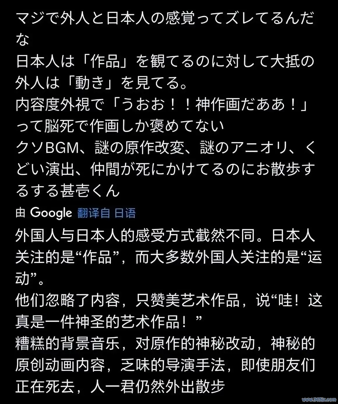 也正是因为日本观众和欧美观众对于这一集的不同看法,两边也是在外网上直接互喷了起来。其中,日本观众嘲讽欧美观众只会关注动作场面多盈策略,无视谜一样的改编,谜一样的BGM,根本不懂动画,而欧美观众则反击说日本观众让《租借女友》这种烂作出了五季,他们的意见根本没有任何价值。